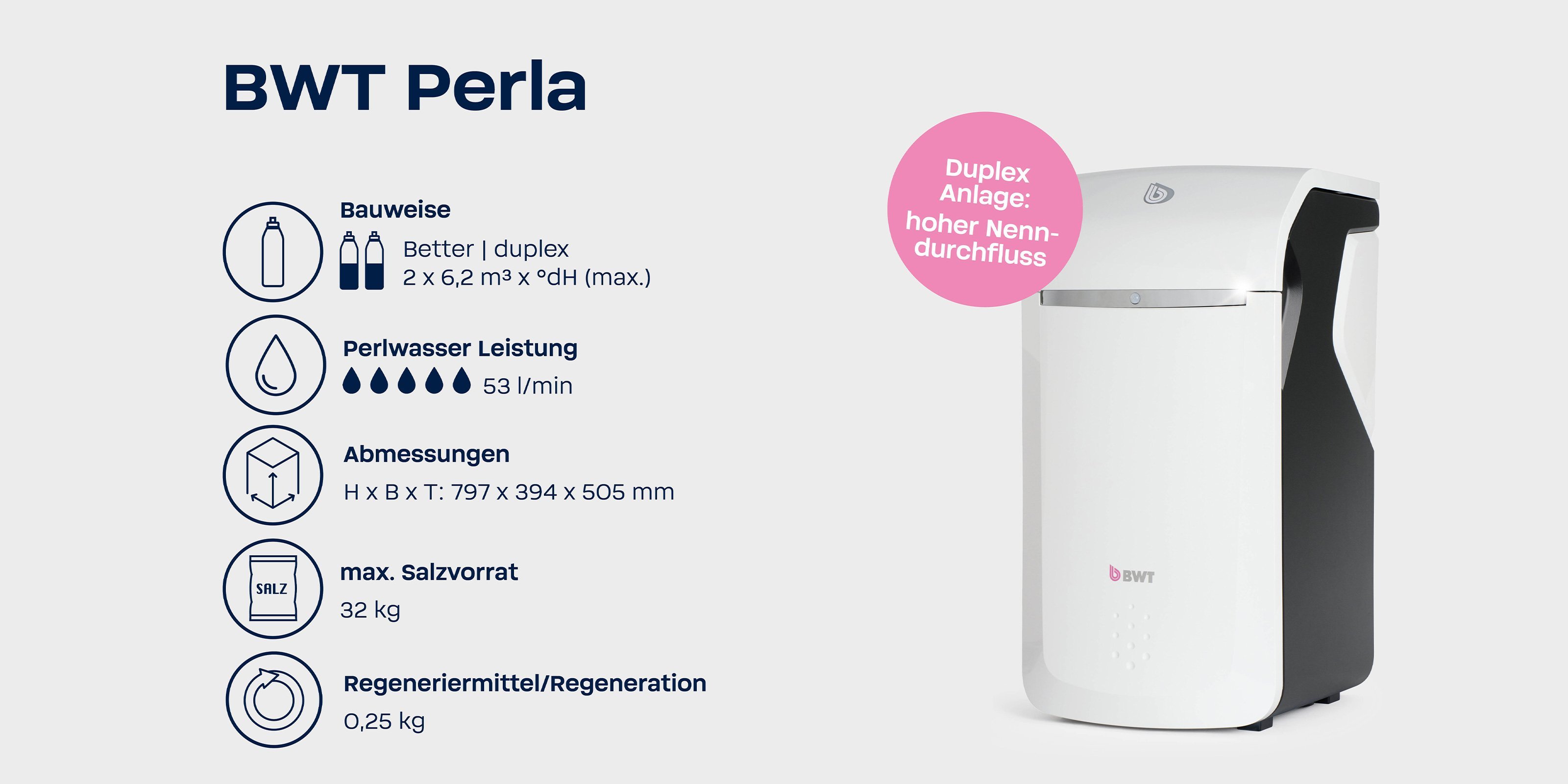 Die Enthärtungsanlagen von BWT verwandeln selbst sehr hartes Wasser in seidenweiches Perlwasser, das im gesamten Haus zur Verfügung steht. Je nach Modell sorgen Simplex- oder Duplexsysteme dafür, dass auch bei höherem Wasserbedarf jederzeit aufbereitetes Wasser zur Verfügung steht.